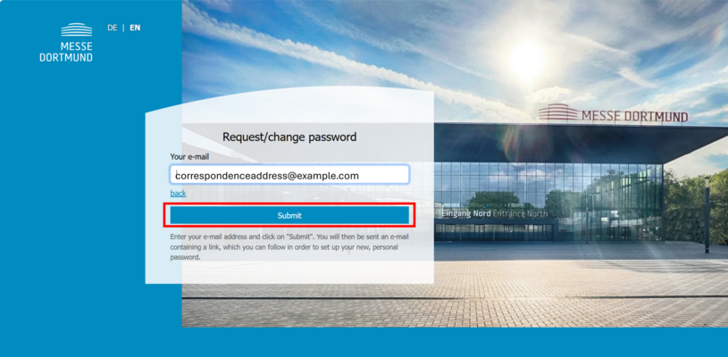 In the field "Your e-mail", enter the email address you provided as the “CONTACT PERSON (CORRESPONDENCE ADDRESS)” during your stand registration.