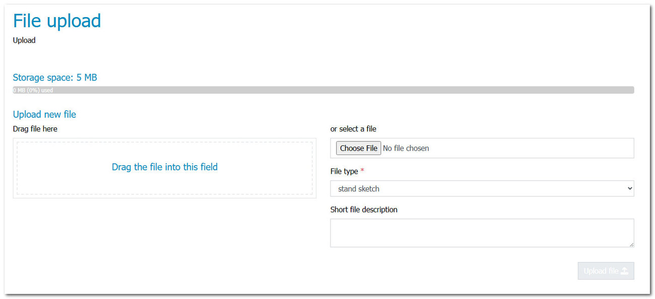 You will find the upload function at the bottom of the page. You can either drag and drop the file to be uploaded from your computer into the ‘Drag the file into this field’ area or select the file from your computer using the ‘Choose File’ button. Then select a suitable data type, optionally add a short description and click on the ‘Upload file’ button.