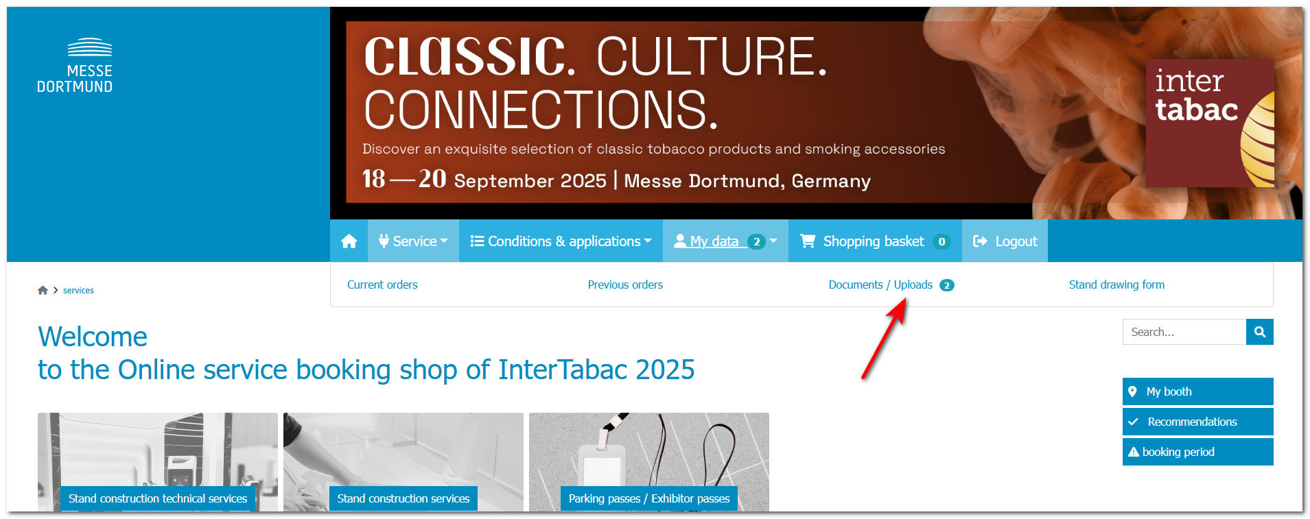 In the service booking shop, click on ‘My data’ and then on ‘Documents / File upload’.