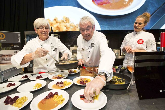Gute Noten bekam auch das neue WILD FOOD FESTIVAL in der Westfalenhalle. „Leckeres Wildbret ist heute fester Bestandteil einer modernen, regionalen und qualitativ hochwertigen Küche“, unterstreicht der Präsident des Landesjagdverbandes NRW Ralph Müller-Schallenberg die Bedeutung des Events. „Durch das WILD FOOD FESTIVAL erreichen wir nun ein breites Publikum auch jenseits der Jägerhaushalte.“ Auch Torsten Reinwald, stellvertretender Geschäftsführer des Deutschen Jagdverbandes lobte das neue und vergrößerte Angebot auf der Messe: „Das WILD FOOD FESTIVAL bietet eine klasse Werbeplattform für den heimischen Markt und ist in der Form deutschlandweit einmalig.“ Über den gesamten Messezeitraum hinweg verwöhnten insgesamt 26 Sterne- und TV-Köche sowie Kochexperten aus der Szene die Besucher auf der Bühne und in ihren Workshops mit einem kulinarischen Programm der Extraklasse. Die insgesamt 22 angebotenen Workshops der Starköche waren dabei extrem gut besucht. Neben Köchen wie Johann Lafer, Thomas Jaumann und Daniel Dal-Ben, zeigte auch der humorvolle Food-Experte und TV-Koch Sebastian Lege den Besuchern die vielfältigen Zubereitungsmöglichkeiten von Wild: „Trotz aller Traditionen hat Wild heute ein neues, junges Gesicht, was dafür sorgt, kulinarisch auch von jungen Menschen wahrgenommen zu werden“, so Lege.